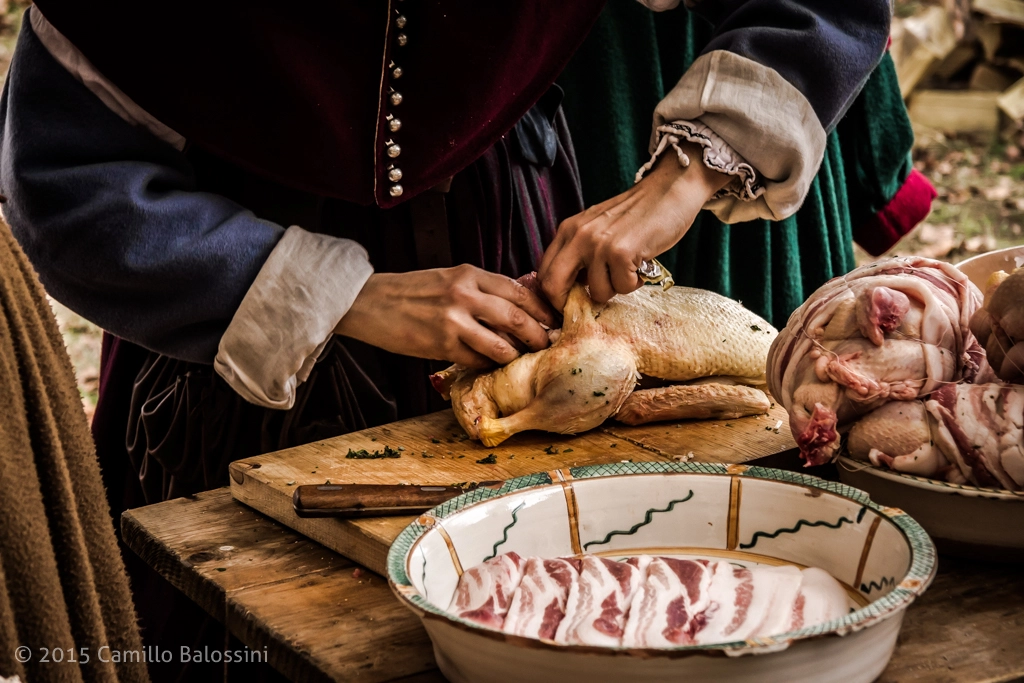 “Piglia l’anatra acconciata e rifatta e ponilo in una pignatta con un poco di persutto e del bono agresto. Aggiungervi maggiorana , noce moscata , zuccaro e salvia. Poi le prugne secche. Cocila e poi la imbandirai.”